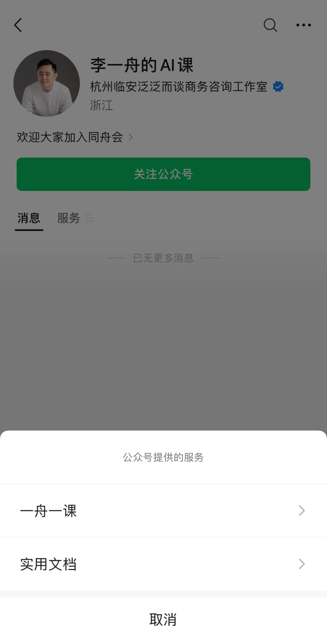 记者发现,公众号“李一舟的AI课”目前仍然提供“一舟一课”服务,不过该公众号主页目前已无任何内容,点入“一舟一课”店铺主页发现也已经无法正常使用相关功能。