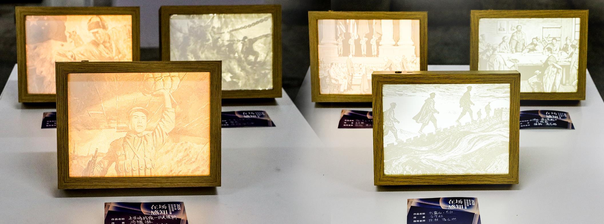 展览现场,以现代视角诠释历史记忆的文化传承之作令人称赞,而凸显德美共育理念的创作同样精彩纷呈。步入一楼展区中央,十四组红色主题浮雕作品映入眼帘。创作者借助AI增强图片效果,结合透光浮雕与灯光,生动再现了湘赣边界第一次代表大会、遵义会议、飞夺泸定桥、隆化桥堡爆破、上甘岭战役等伟大历史场景,让这些历史记忆在观众眼前变得鲜活立体、触手可及,激发起观众心底的爱国主义情怀。