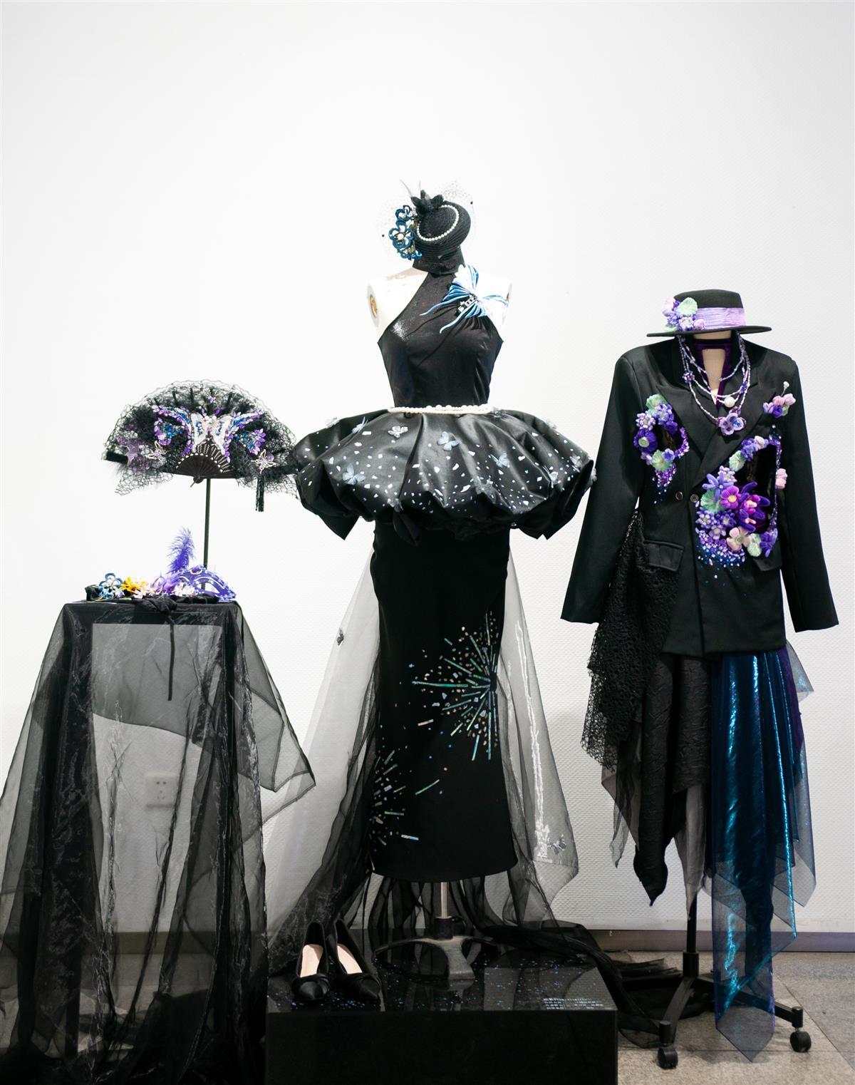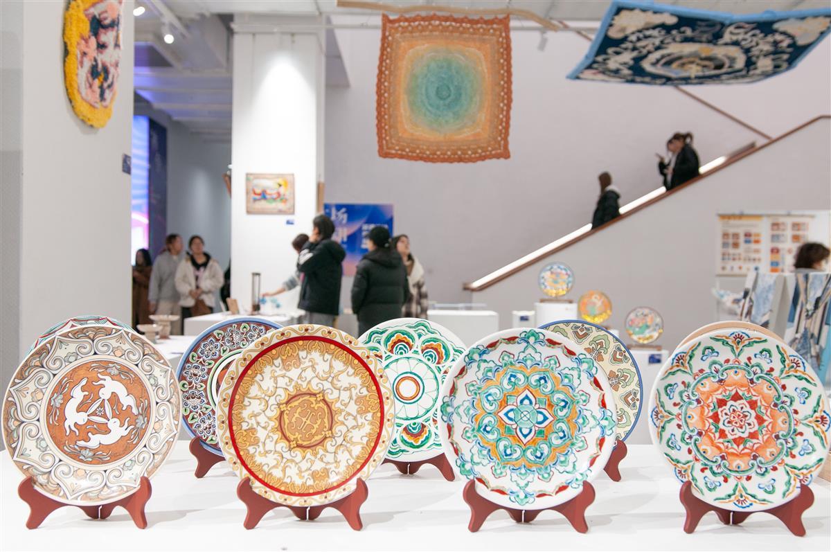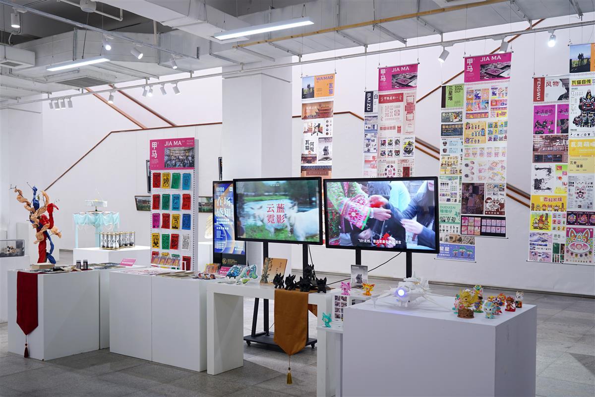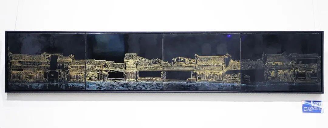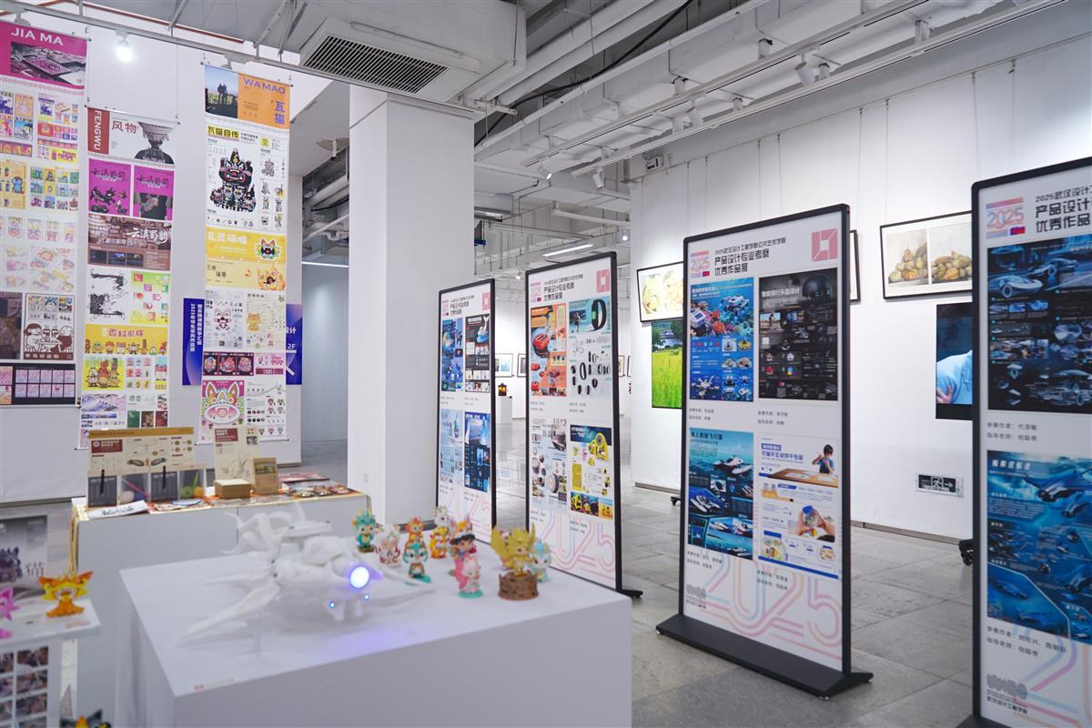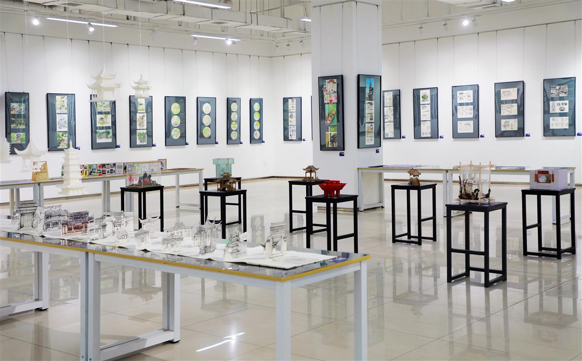 踏入一楼展厅,入口处的漆画戗金作品《水墨间·金韵》格外吸睛,它出自公共艺术学院工艺美术专业学生之手。他们深入南浔古镇采风,运用传统大漆戗金技法,刻痕填漆、贴金莳粉,在金银交织间生动呈现了百间楼的独特风貌。时尚设计学院的学生则前往云南,采集各民族文化印记,经解构、提取等工序,凝练成设计语言。或从银器锻打肌理取材,或重构白族银饰纹样,或借鉴“慢工细作”融入模块化结构,经由深度创作解读,最终幻化成可亲可戴、可赏可观、可触可感的设计之“象”。