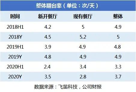 但到了2020年,疫情冲击下,新开餐厅和现有餐厅翻台率均快速下降,其中受冲击最大的为现有餐厅,翻台率下降至2.8次/天。