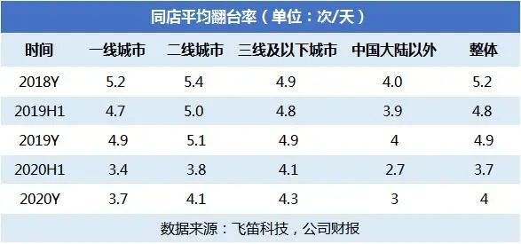 由上面的表格可以看到,海底捞整体的翻台率在2020年之前比较稳定,并于2018年达到5次/天的峰值。但进入2020年,整体翻台率水平下降明显,到2020年底为3.7次/天。
