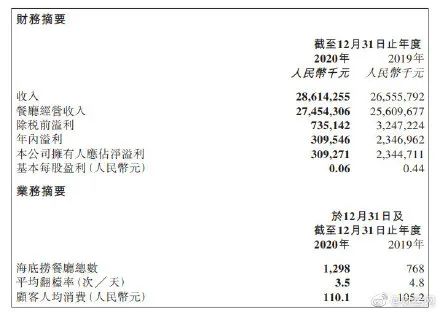 今年3月,海底捞发布业绩报告显示,2020年全年,海底捞集团实现收入286亿元,同比增长7.8%;全年净利润3.09亿元,同比下降86.8%。