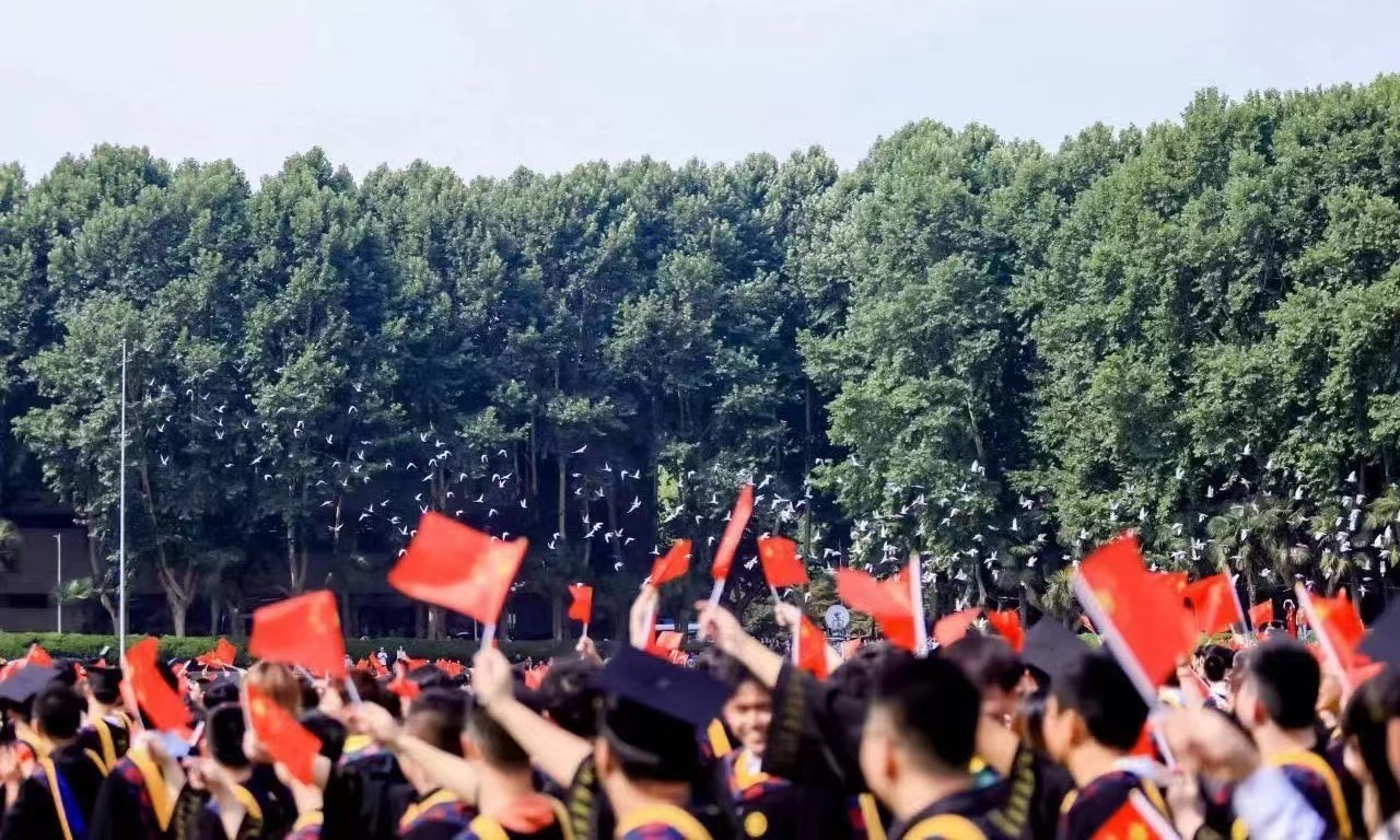 西安交通大学全体师生合唱《歌唱祖国》。伴随着歌声,现场放飞2024只白鸽,祝全体毕业生们展翅翱翔,鹏程万里。