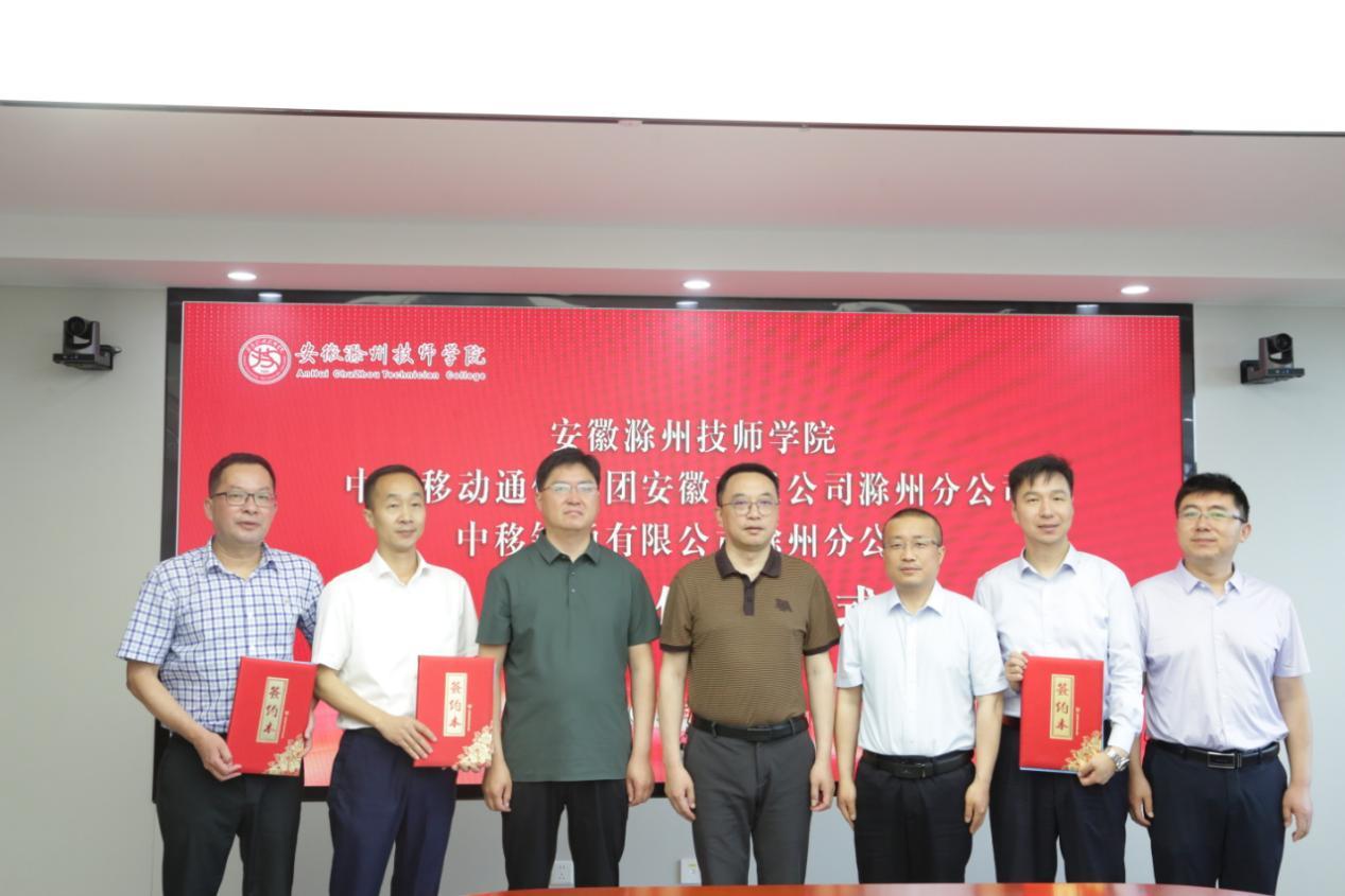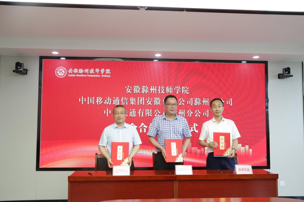 2025年5月19日上午,安徽滁州技师学院与滁州移动、滁州铁通签署战略合作协议,开启了校企合作、产教融合的新篇章。滁州市人力资源和社会保障局党组成员、副局长仲卫东,安徽移动滁州分公司党委书记、总经理李华文,中移铁通有限公司滁州分公司总经理张斌,安徽滁州技师学院党委书记陈通等出席签约仪式,会议由学校党委副书记、校长湛承鲲主持。