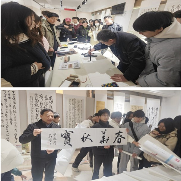 其间,安徽省高等学校书法家协会的书法家们还在展览现场和铜陵学院师生举行笔会。他们挥毫泼墨,创作了一幅幅力透纸背、龙飞凤舞的书法作品,将现场创作的作品赠送在场。参加笔会的师生纷纷沉浸在书法的姿态美、意境美之中,不时与书法家们对书法技艺、字体流派、发展历程等展开交流。笔会以书法为桥梁,广大师生领略了书法艺术的千年韵味,感受了中华传统文化的博大精深。