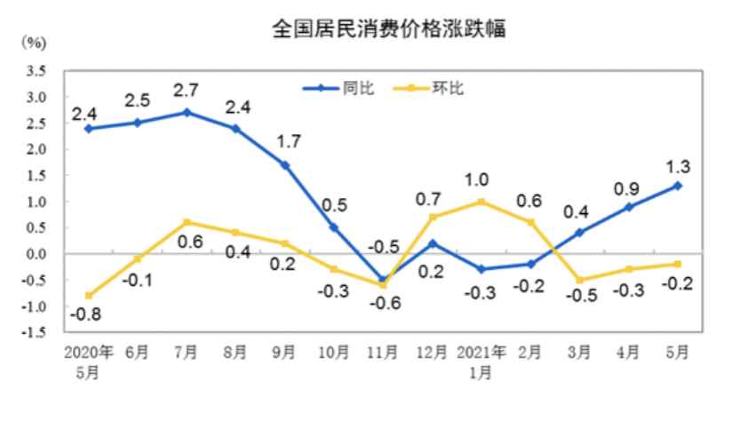 | 图/ 2021年5月份居民消费价格同比上涨1.3%,环比下降0.2%(国家统计局)