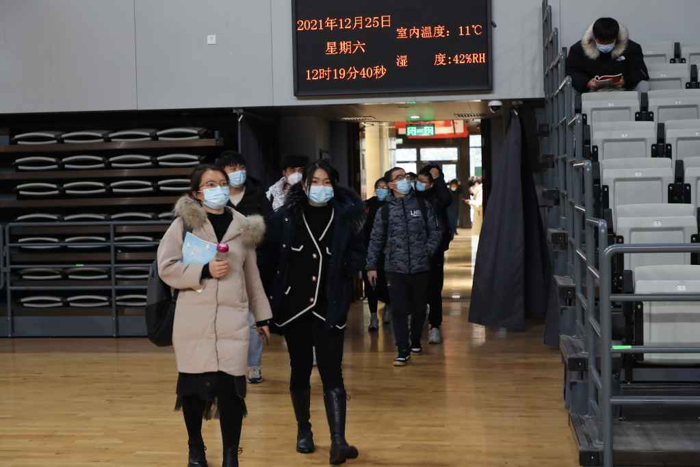 12月25日,西安的考生们在风雪中走进2022年全国硕士研究生招生考试的考场。为确保校外考生能有一个较为舒适安全的午间休息场所,西安电子科技大学特开放远望谷体育馆供校外考生使用。