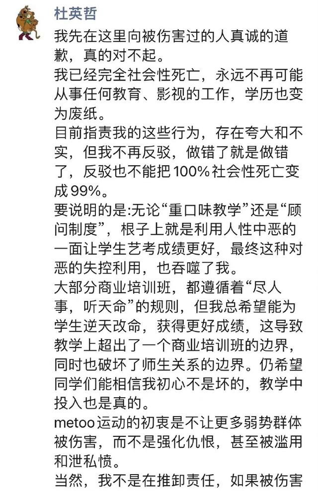 杜英哲强调他的“重口味教学”是利用人性中的恶让艺考考生成绩更好,但最终自己没能控制住人性的恶,自己也被吞噬。又说他的初心不是坏的,教学中的投入也是真的,“metoo”运动的初衷不是让更多弱势群体被伤害,而不是强化仇恨,甚至被滥用和泄私愤:“当然,我不是在推卸责任,如果被伤害的人认为我应被严惩,可向警方报案,我会配合调查。”