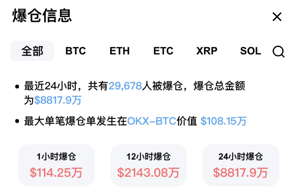 Coinglass数据显示,最近24小时,虚拟币市场共有近3万人被爆仓,爆仓总金额达8817.9万美元(折合人民币近6亿元)。