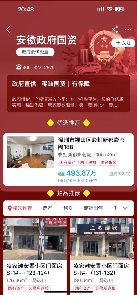 目前,安徽政府国资部分已上线阿里资产平台,包含各类住宅产品、商铺、公寓、租赁等,种类齐全,政府送拍,安心、放心,感兴趣的朋友,可打开手机淘宝,点击阿里拍卖,搜索“安徽政府国资”可一键直达,挑选超高性价比投资品。