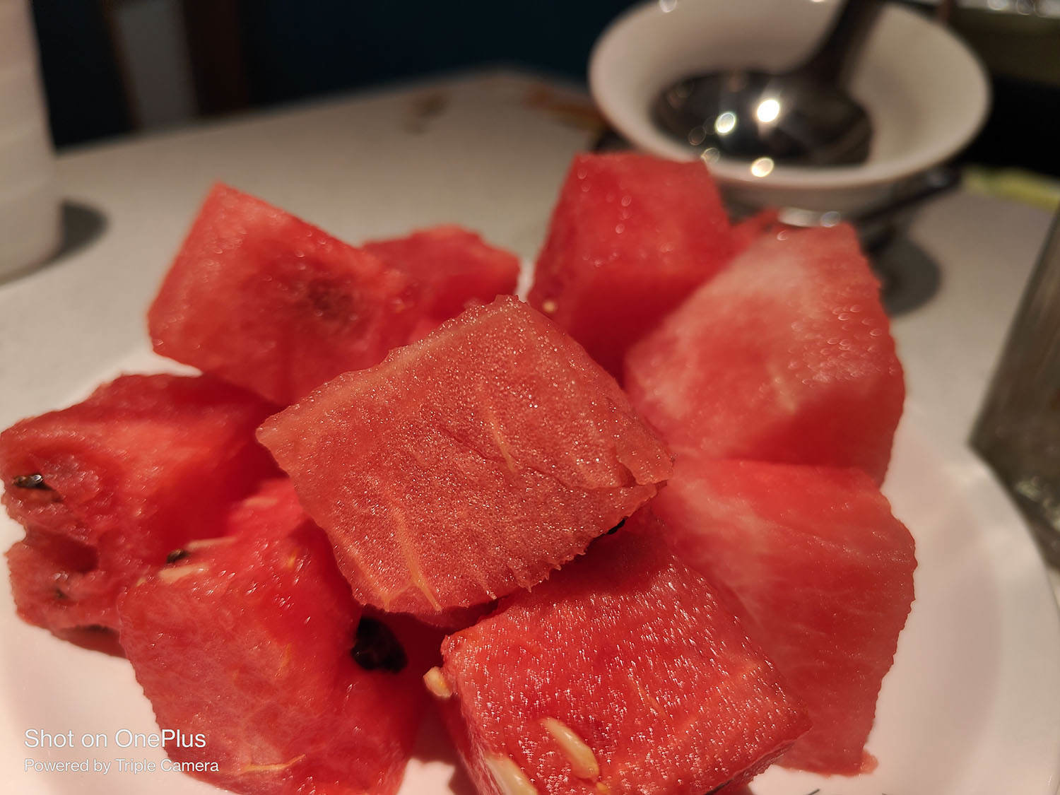 拍摄食物类则是会进行色彩艳丽的调节,颜色更加诱人,而在拍摄效果上,能过够将西瓜块上面的沙以及纤维拍摄清晰,效果也是相当给力了。