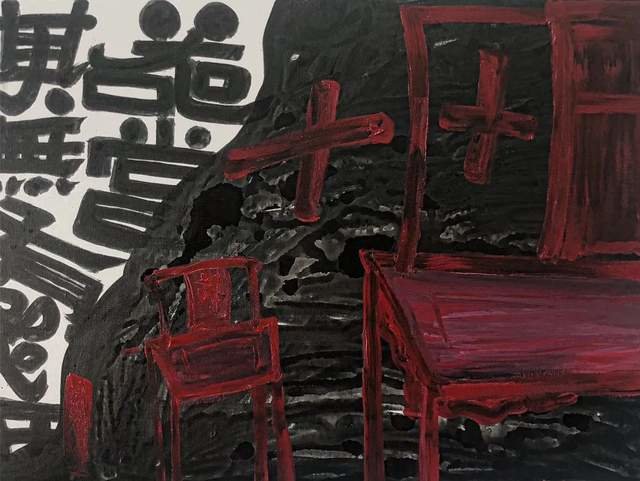 王隽彦 《一桌二椅的当代表达》 布面丙烯、水墨 60×80cm 2022