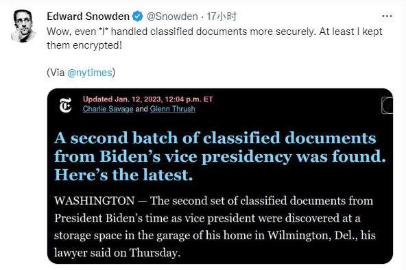 曾因泄露美国“棱镜计划”监听项目的爱德华·斯诺登发推嘲讽道,“哇,就连我都以更安全的方式处理机密文件了。至少我把它们加密了!”他在推特上表示,真正的问题不是拜登持有机密文件,而是司法部在中期选举前一周就知道这件事,但却选择把事情压下去,从而带来了党派优势。