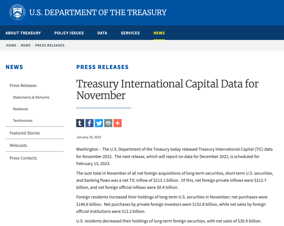 周三(1月18日),美国财政部公布2022年11月的国际资本流动报告(TIC)。