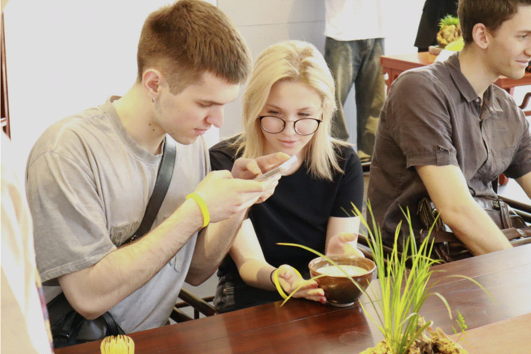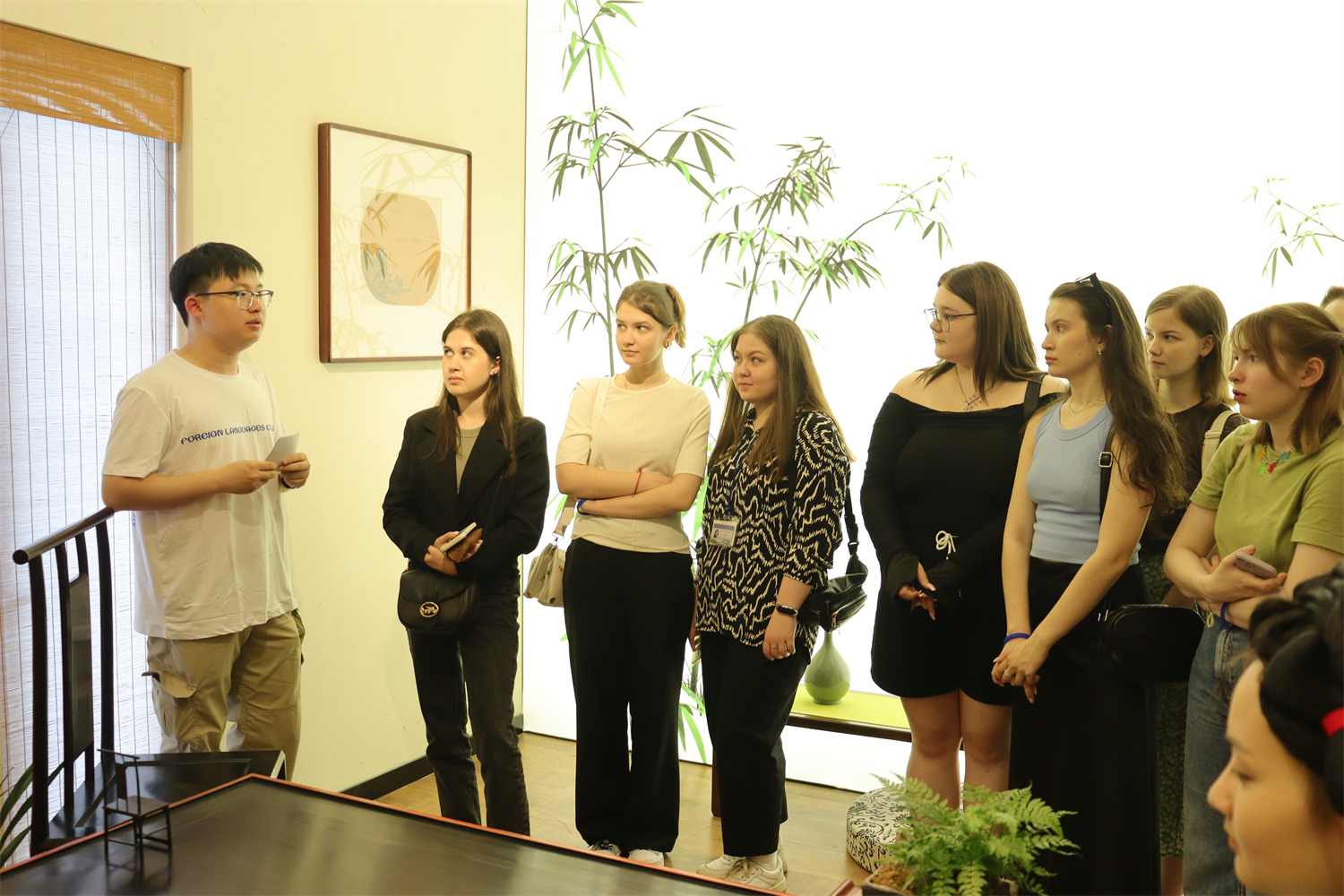 参观过程中,俄罗斯留学生们欣赏了一幅幅包含宋代人文底蕴的画作,了解了宋朝的传统家具文化。浙江万里学院外语学院的学生们用英语向俄罗斯留学生们介绍着宋朝家具的特点和设计理念。“这是我第一次近距离了解中国的家具,这些家具实在太美了,中国匠人的精神让我折服。有机会的话,我想看到更多的中国家具,了解更多的中国故事。”俄罗斯学生Polina激动地说。现场还布置了点茶工艺体验环节和汉服展示环节。茶艺师们展示了点茶的流程,介绍了点茶礼仪和茶具的文化内涵。俄罗斯留学生们亲自体验了点茶的乐趣。
