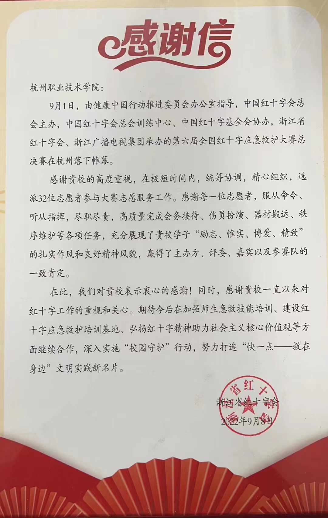 黄元龙作闭幕式讲话。他对获奖的选手们表示衷心祝贺,并对大赛的精心组织表示充分肯定,希望同学们以此次大赛为起点,继续精进应急救护技能,时刻准备着在危急时刻“会出手”“能出手”“敢出手”,争做群众身边的急救英雄。同时,黄元龙为杭职院在参与第六届全国红十字应急救护大赛中的学生志愿者们现场颁发了证书和感谢信,向杭职院参与全国第六届红十字应急救护大赛决赛的30名学生志愿者表示衷心感谢!
