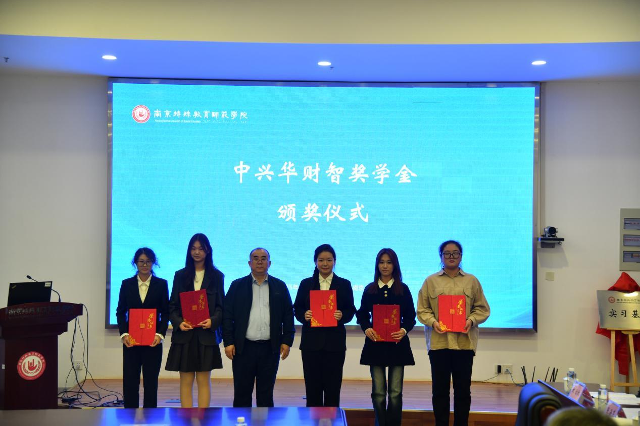 仪式上,首届“中兴华财智奖学金”获奖名单揭晓,高飞与李大胜共同为胡贝、柴米萱等10名财务管理专业优秀学生颁奖。该奖学金由中兴华会计师事务所江苏分所专项设立,用于激励财务管理专业学生勤奋学习、精进专业,同时也助力融合教育学生的成长与发展。