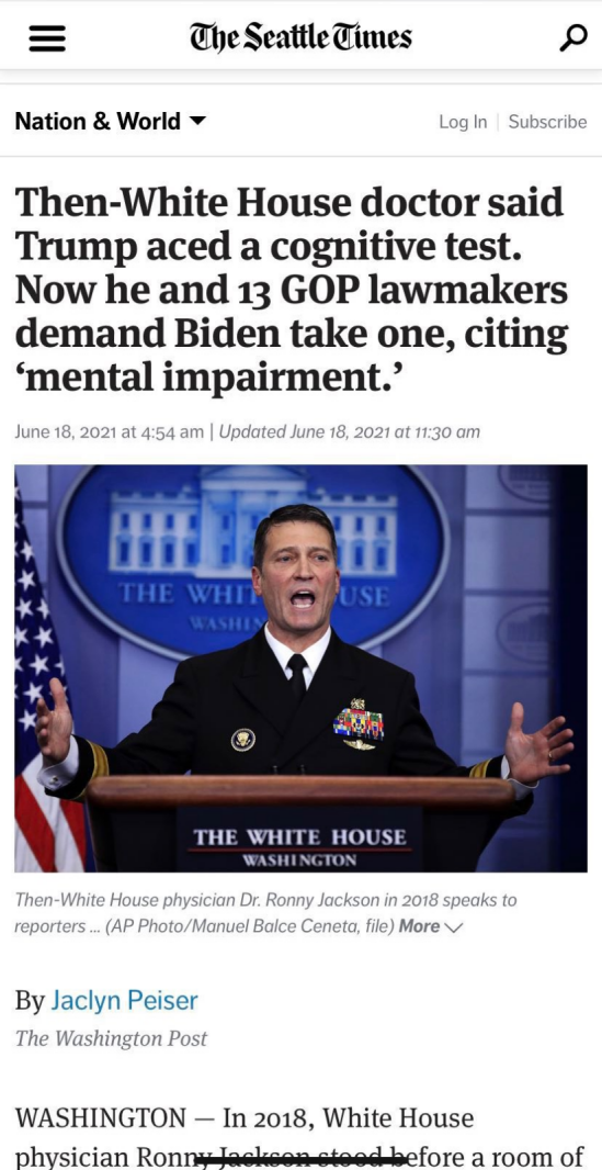 白宫没有立即回应任何媒体的置评请求。但是在美国网络上,这件事已经被网友们玩成了一个梗,在6月19日,《华盛顿邮报》相关报道下面,竟然有3400多条评论,一般情况下,该报文章下能有几十个评论就不错了。至于原因,美国老百姓人人都知道此事渊源,2018年特朗普当总统的时候,民主党议员们众口一词称他“脑子有问题”,要求他接受认知能力测试,而牵头做测试的就是当时的白宫医疗小组主管,即俗称的白宫医生,海军少将罗尼·杰克逊。杰克逊后来成为得克萨斯州的联邦众议员,就是上面要求拜登做检查的那份公开信的第一作者。