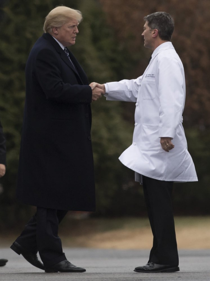 | 图/前总统唐纳德·特朗普在 2018 年进行年度体检后与白宫医生罗尼·杰克逊握手。