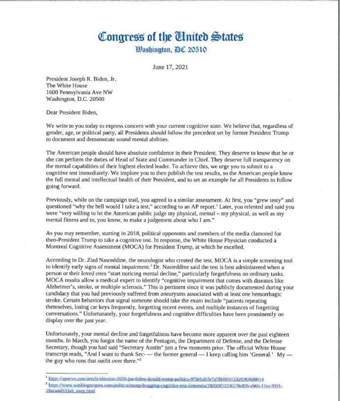 我们今天写信给您,表达对您当前认知状态的担忧。我们认为,无论性别、年龄或属于哪个政党,所有总统都应遵循前总统特朗普设定的先例,记录和展示其健全的心智能力。