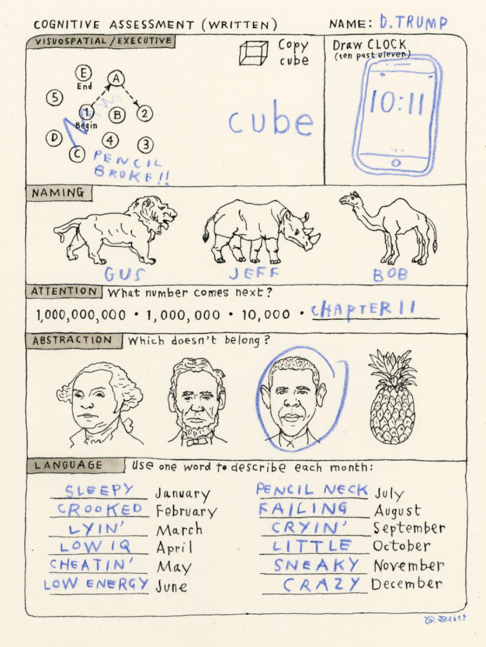 | 图/漫画家兼插画家巴里·布利特在《纽约客》杂志上刊发的一则漫画:特朗普通过认知测试