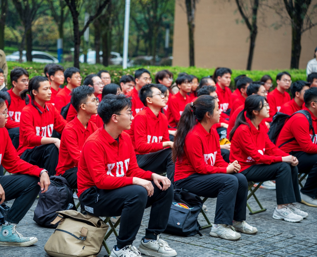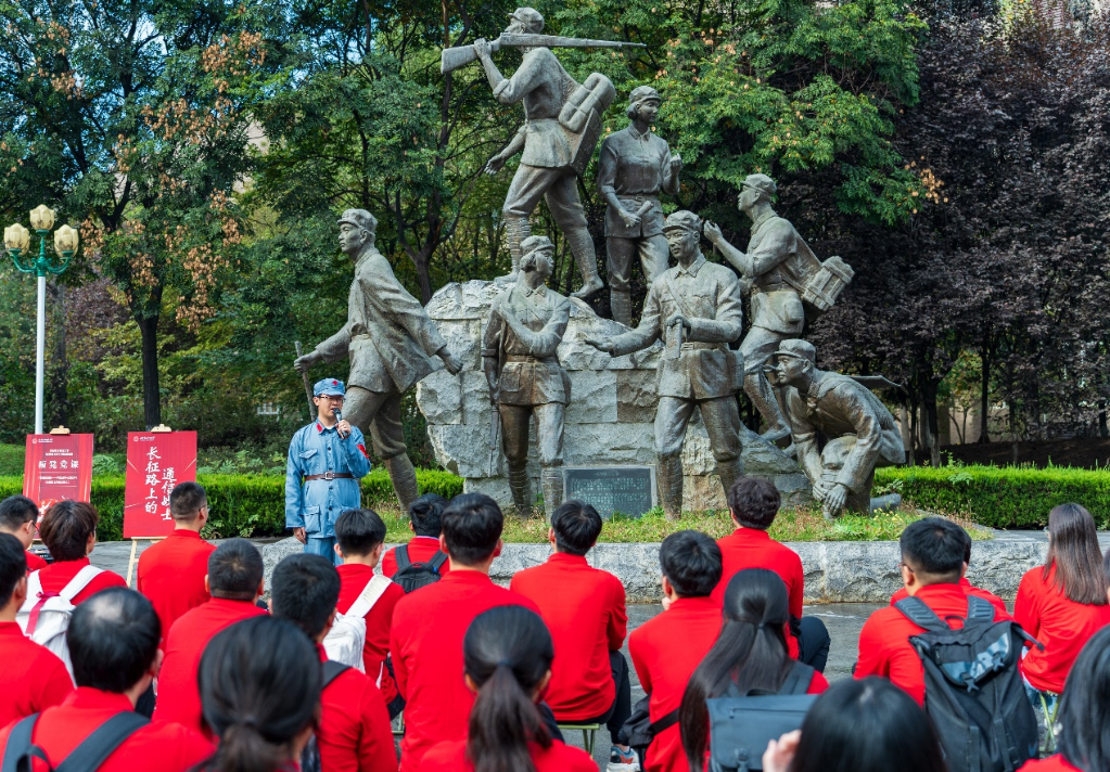 “我手中的这支铅笔在大家看来可能是最为普通的学习用具,但是在当时通校学员眼中,它可是一件‘奢侈品’。那时候没有纸,学员们就把土地抹平在上面写字,把牛皮用火烤硬了在上面画图。白天行军,晚上就在树林火堆边围着学习电工知识,欧姆定律、串联并联……”10月31日下午,“长征路上办学”雕塑前摆放着一排排小马扎,同学们整齐、安静地坐在这里认真聆听党课,还吸引了不少路过的同学驻足听讲。党史校史宣讲团的郝芮眷正在讲述着当年通校学员如何在艰苦卓绝的条件下,边打边学、边走边学,最终正式成为通信兵的励志故事。