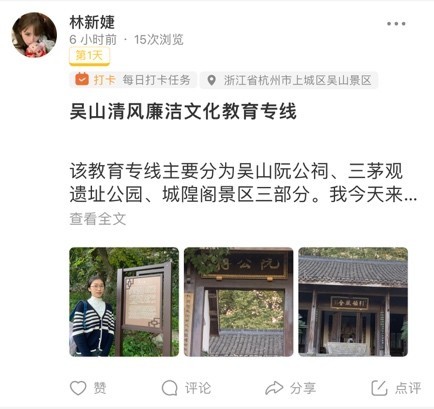 据介绍,此次廉洁行走活动,学院党校精选了西湖周边的7个省市级廉洁主题教育基地,包括岳王庙、于谦祠、“五四”宪法纪念馆、中国共产党杭州历史馆、钱王祠、浙江省革命烈士纪念馆、吴山清风廉洁文化教育专线等,要求广大学员充分感受西湖周边历史文化景点中的廉洁元素,努力以先贤为榜样,明大德、守公德、严私德,清清白白做人、干干净净做事。