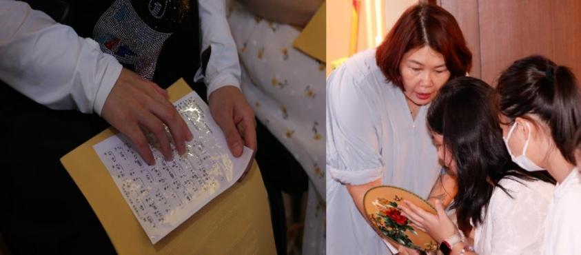 接下来的无障碍互动体验环境是本次活动的最大亮点。组织方根据视听障碍群体的不同需求精心设计,请视障伙伴使用盲文乐谱跟随昆曲演员示范和现场伴奏,学唱经典昆剧唱段;而听障伙伴则是穿上水袖登上舞台,在演员亲身示范教学下,表演昆曲标志性的水袖动作。此环节还安排4位伙伴体验昆曲妆造,化妆师们在她们脸上勾勒出简单的脸谱,登上舞台手持道具,感受戏剧人物的内心。现场互动妙趣横生,障碍伙伴能亲身参与到昆曲演绎中都非常的开心,欢乐之余体验前所未有的艺术享受。