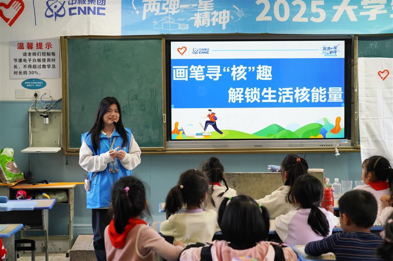 在江夏区鸿华希望小学,主讲人胡圆圆以“画笔寻‘核趣’,解锁生活核能量”为主题,结合生活实例将抽象的核能知识转化为妙趣横生的科普内容。孩子们用树叶拼贴火箭、用手印画布寄托航天梦想,在创作中种下科学与爱国的种子;在藏龙社区,“碳中和与垃圾分类”科普活动通过卡通短片、互动问答,让核能知识与环保理念深入家庭,亲子家庭共同制作“低碳火箭”手工作品,在温馨互动中传递环保理念与无私奉献精神。