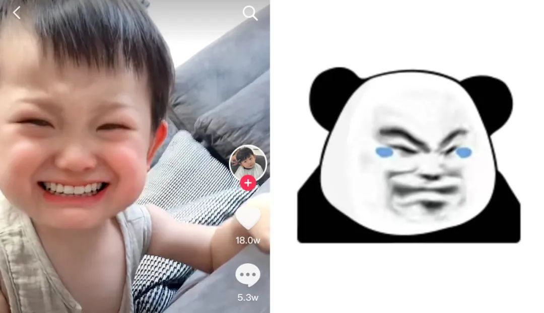 仍然是拍摄小宝宝,当一个哭泣的小孩被配上假笑滤镜,让机哥想起有个熊猫头表情,你们看看,像不像: