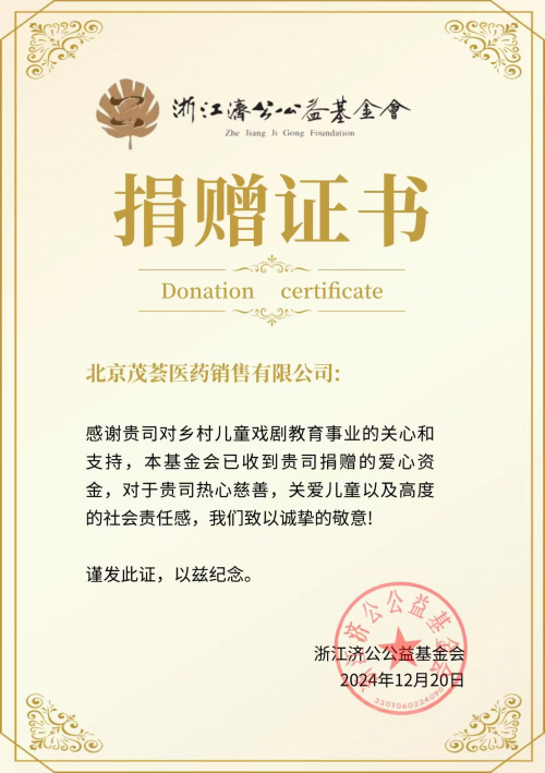 2024年12月20日,九九三零生物技术有限公司全资子公司北京茂荟医药销售有限公司代表9930向浙江济公公益基金会捐赠现金30万元,此捐赠将用于支持健康善念公益,旨在为健康济民做一点实际工作。